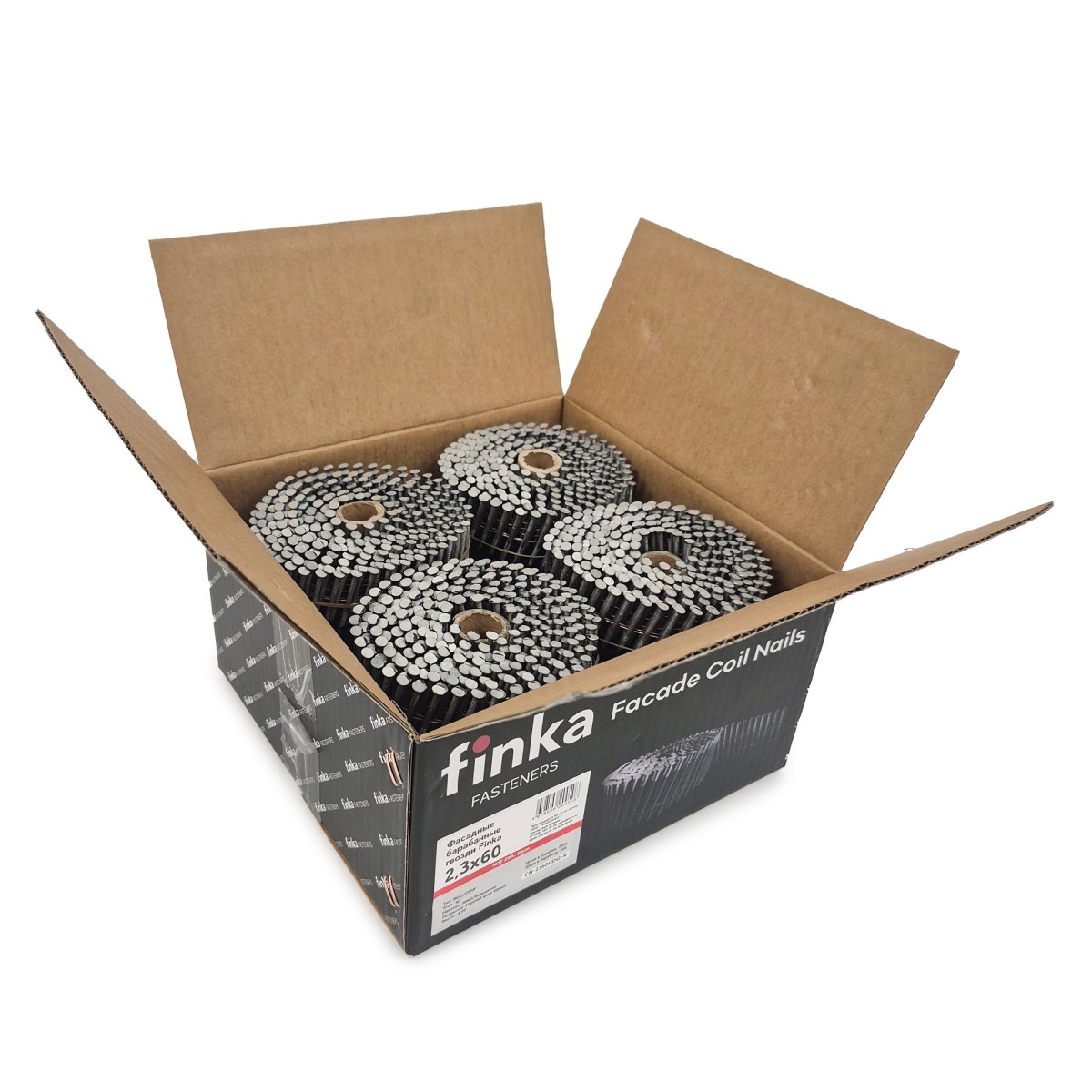 Фасадные барабанные гвозди Finka упакованы в супер качественную и прочную коробку из пятислойного картона с добавлением картонных втулок. Такой тип упаковки позволяет сохранить геометрию бобины при доставке.